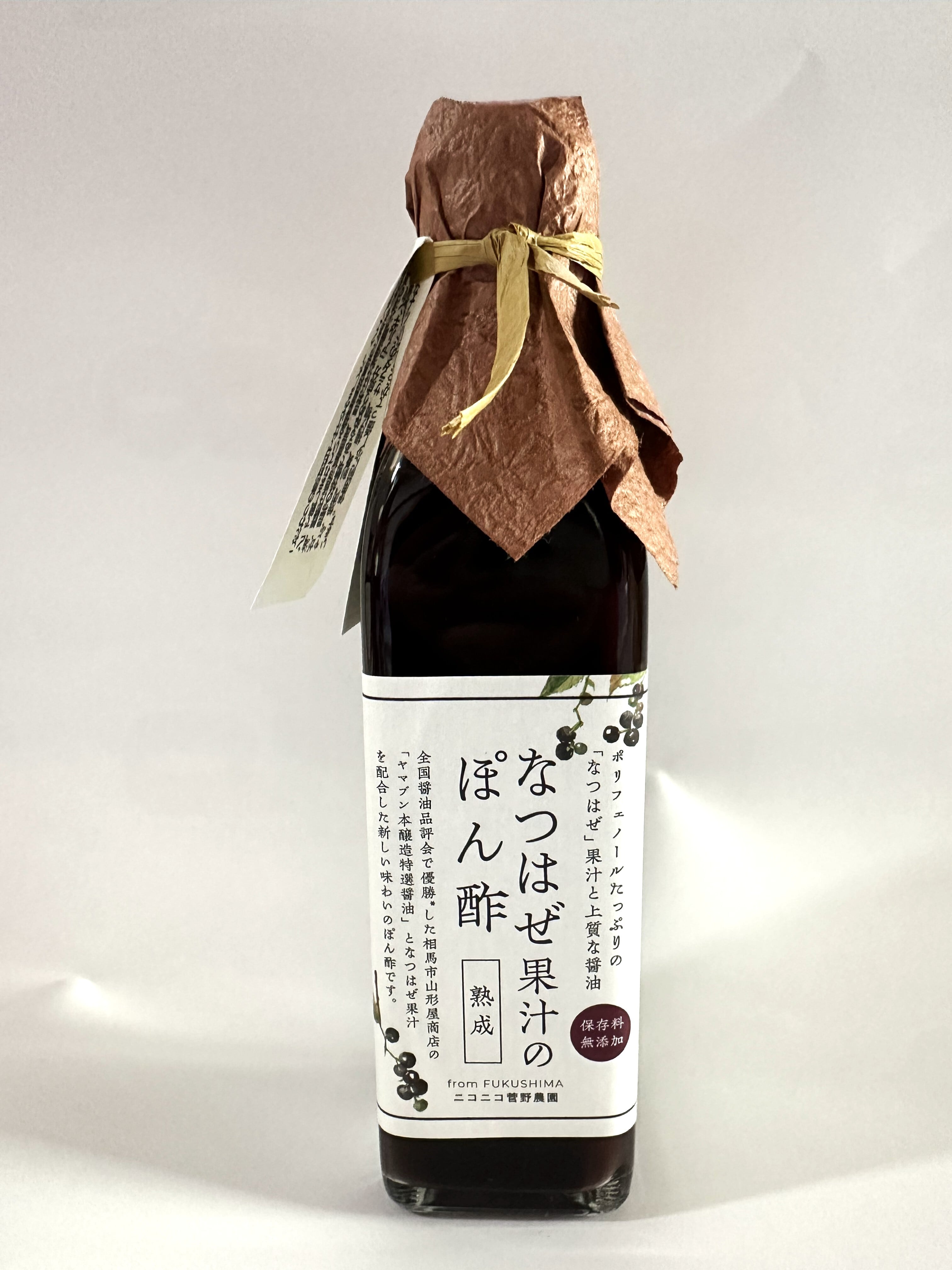 ナツハゼ果汁に、農林水産大臣賞を受賞している相馬市「山形屋商店」の濃口しょうゆを合わせ、北海道噴火湾の真昆布と鹿児島県産の鰹節の旨味で1か月間熟成したポン酢です。飯舘村産黒毛和牛を使った創作料理から生まれた商品です。肉料理、魚料理、刺身、温野菜とどんな料理にも合います。