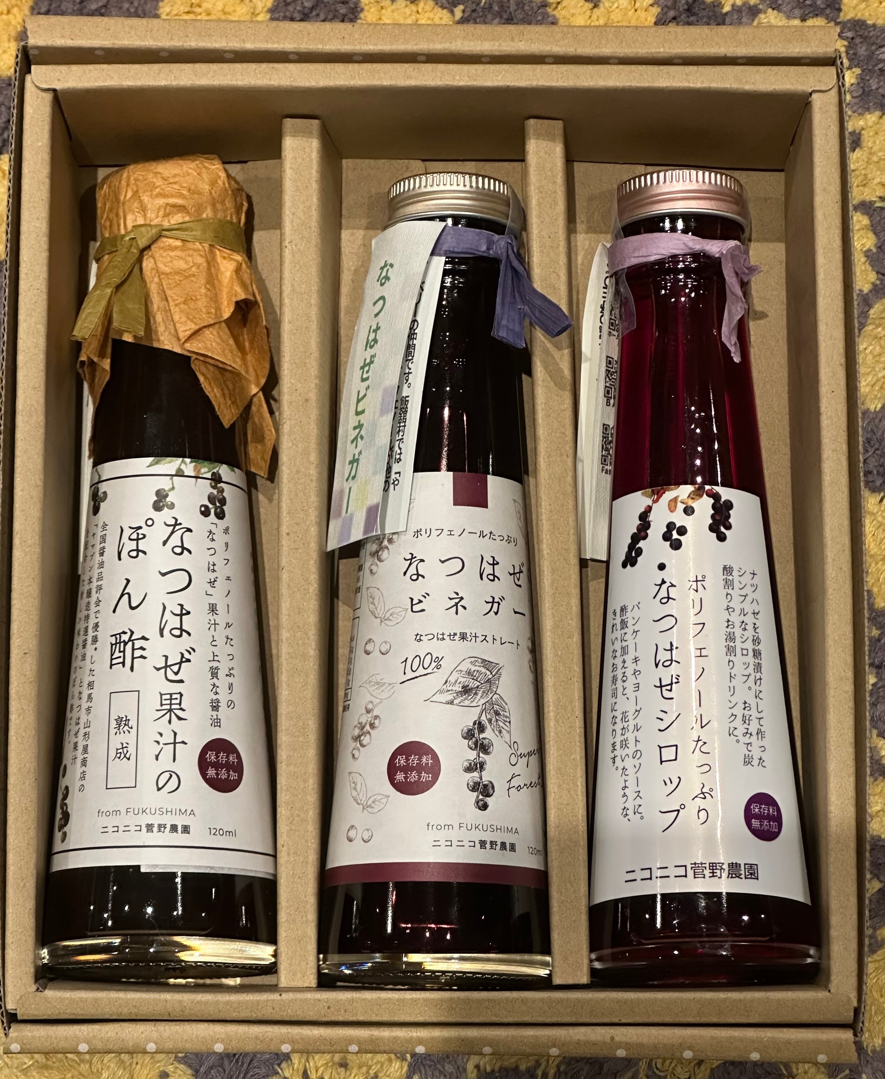 ポン酢は、ナツハゼ果汁に農林水産大臣賞を受賞している相馬市「山形屋商店」の濃口しょうゆを合わせ、北海道噴火湾の真昆布と鹿児島県産の鰹節の旨味で1か月間熟成したポン酢です。飯舘村産黒毛和牛を使った創作料理から生まれた商品です。肉料理、魚料理、刺身、温野菜とどんな料理にも合います。ナツハゼは農薬不使用で栽培し、PH3.9まろやかな酸味、保存料不使用、無着色。シロップは、ナツハゼを砂糖(てんさい糖)漬けにして抽出したもの。ビネガーは、ナツハゼを搾汁した100%果汁で、料理に使えます。